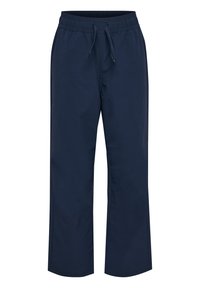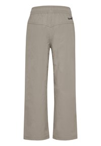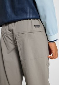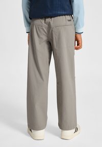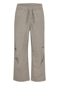 Szare lekkie spodnie z elastycznym pasem, o luźnym kroju. Noszone z białymi i beżowymi sneakersami ozdobionymi czarnymi akcentami.