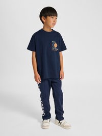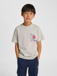 Młody chłopiec stojący, ubrany w jasnoszarą koszulkę z czerwoną grafiką koszykówki i siatki, granatowe spodnie dresowe oraz białe trampki z czarnymi paskami.