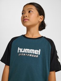 Młoda dziewczyna ubrana w turkusowo-czarną sportową koszulkę Hummel i czarne spodnie z białymi pasami w kształcie jodełki, patrzy lekko w prawo.