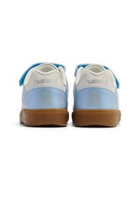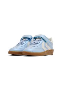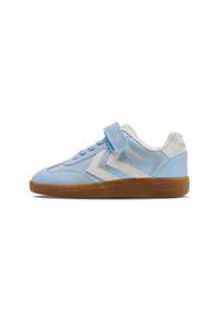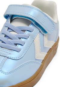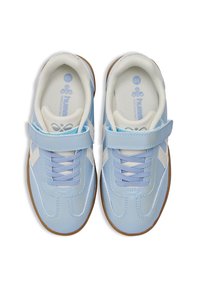 Jasnoniebieski sneaker z białymi akcentami, gumową podeszwą i zapięciem na sznurówki. Posiada pasek na rzep dla dodatkowego zabezpieczenia.