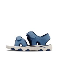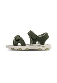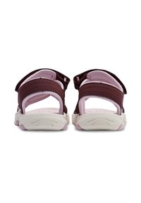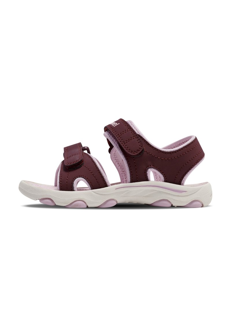 Bordowe sandały z podwójnymi paskami na rzep, różową wyściółką i białą podeszwą z okrągłymi wzorami bieżnika. Otwarta konstrukcja zapewniająca przewiewność.