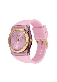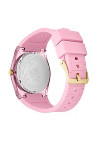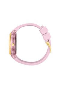 Różowy zegarek ze złotymi akcentami i różowym cyferblatem, z wyświetlaczem daty i silikonowym paskiem, otulony w falującą różową tkaninę w tle.