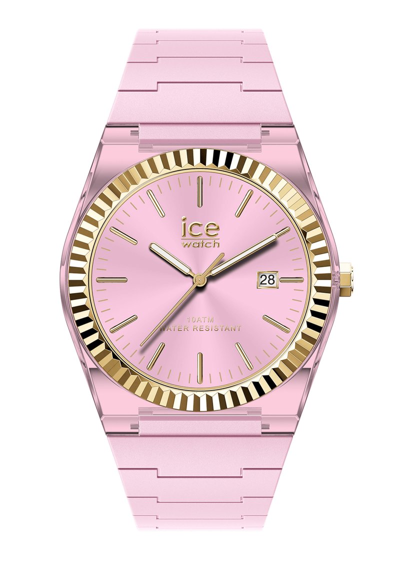 Różowy analogowy zegarek na rękę z złotą ryflowaną ramką, złotymi znacznikami godzin i wskazówkami, wyświetlaczem daty oraz różowym paskiem z ogniwami.