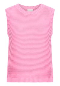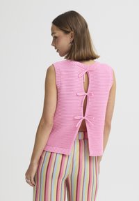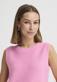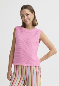 Uśmiechnięta kobieta o krótkich brązowych włosach, ubrana w różowy bezrękawnik dzianinowy i wielokolorowe spodnie w pionowe paski, pozująca z jedną ręką na biodrze.