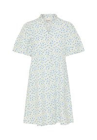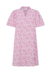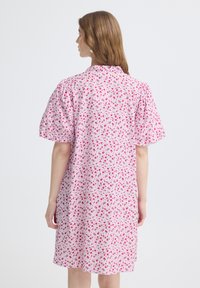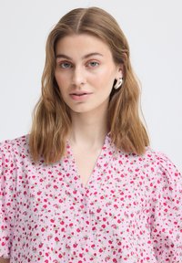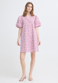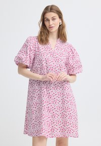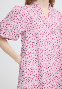 Kobieta w różowej sukience z drobnym czerwonym kwiatowym wzorem i bufkami na krótkich rękawach, stojąca na jednolitym jasnym tle.