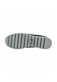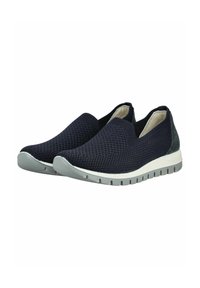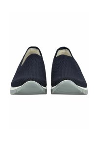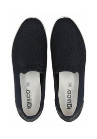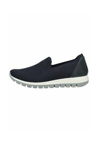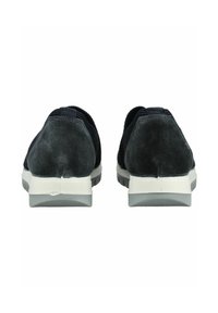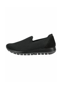 Czarny tenisówka wsuwana z oddychającą siateczkową cholewką, szarą zamszową piętą oraz białą, segmentowaną gumową podeszwą, przeznaczona do codziennego noszenia.