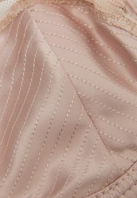 Młoda kobieta o długich brązowych włosach, ubrana w jasnoróżowy koronkowy biustonosz i pasujące majtki na jednolitym białym tle.