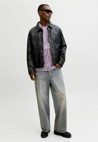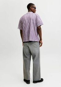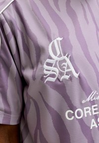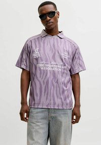 Mężczyzna w czarnych okularach przeciwsłonecznych i luźnej liliowej koszulce polo w zebrę z białym napisem oraz jasnoniebieskich dżinsach, pozujący na jednolitym tle.
