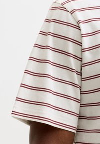 Biały t-shirt w paski z bordowymi liniami, z okrągłym dekoltem i małym haftowanym logo na piersi, noszony z dżinsowymi szortami.