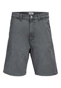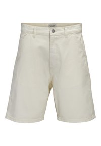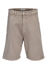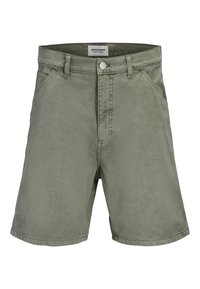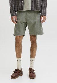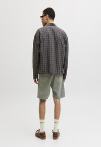 Mężczyzna w oliwkowo-zielonych szortach, kremowych skarpetkach z czarnym napisem, brązowych skórzanych butach, koszuli w kratę oraz zielonej koszulce widocznej spod krawędzi koszuli.
