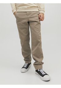 Beżowe bawełniane spodnie o luźnym kroju, z przednimi kieszeniami i mankietami, zestawione z czarnymi trampkami z białymi sznurowadłami. Jednolite tło.