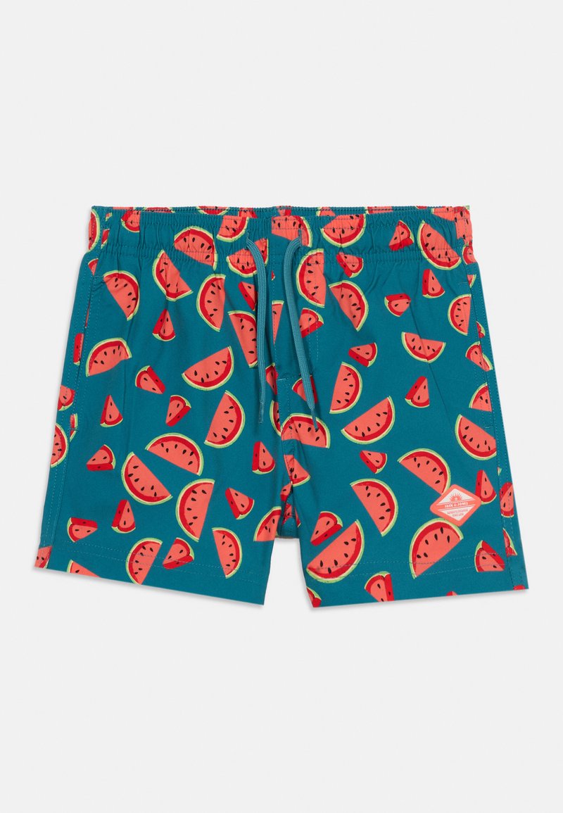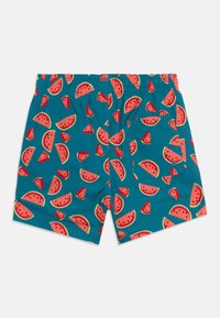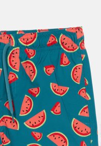 Niebieskie kąpielówki z czerwonym nadrukiem plasterków arbuza, regulowany pas na sznurek oraz boczne kieszenie.
