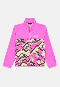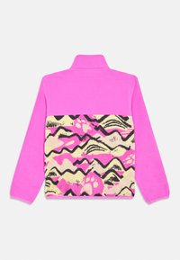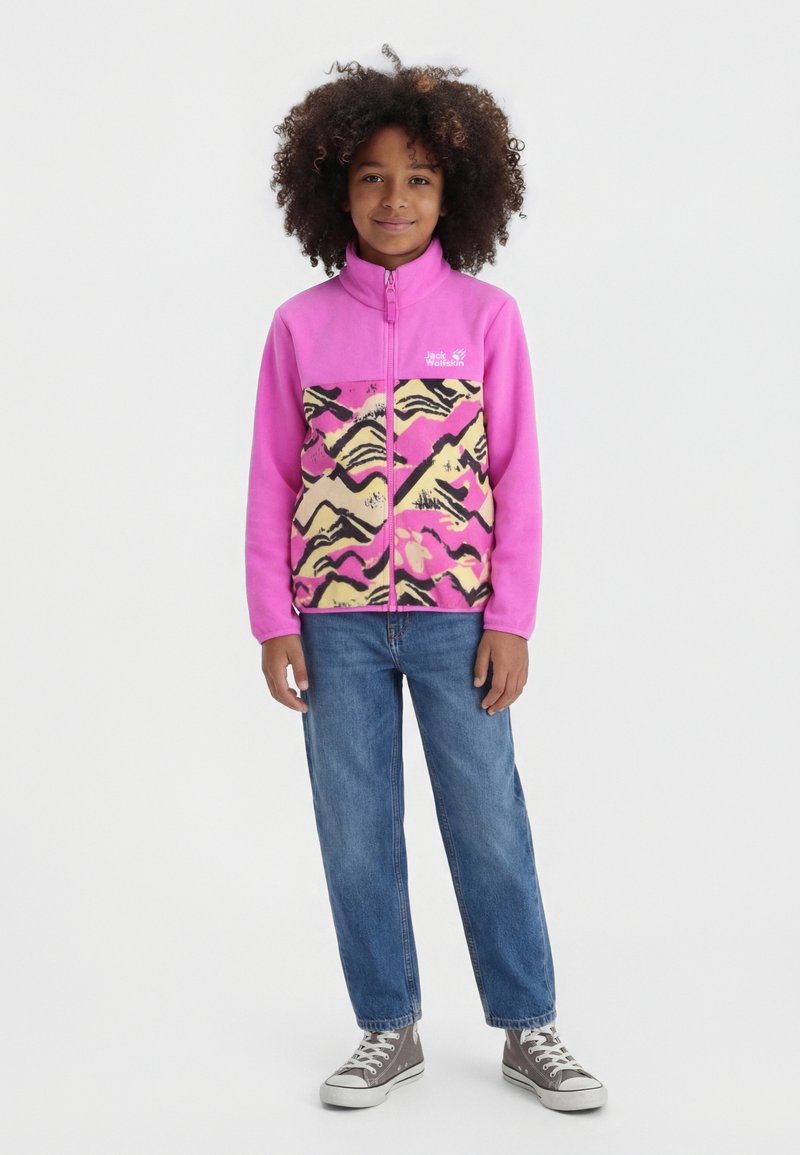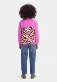 Dziecko z kręconymi włosami w różowej kurtce zapinanej na zamek z nadrukiem gór, niebieskich dżinsach i szarych wysokich trampkach, stojące na białym tle.