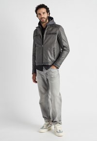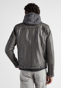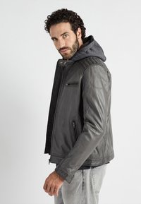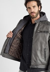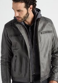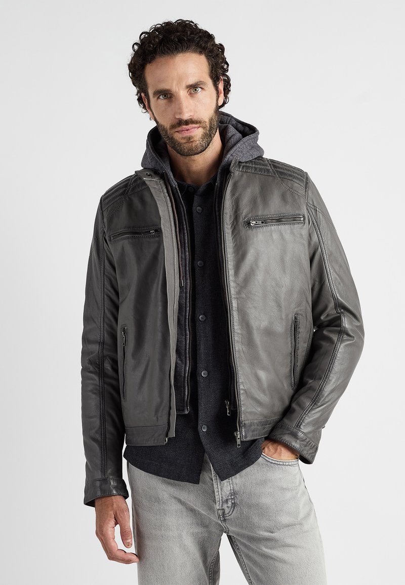Szara skórzana kurtka z kapturem, z czterema kieszeniami na zamek i teksturowanymi akcentami na ramionach i rękawach, noszona na ciemnej koszuli.
