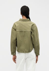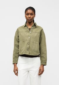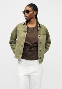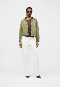 Kobieta z warkoczami, ubrana w oliwkowo-zieloną kurtkę na guziki i białe spodnie, stoi na tle jednolitego jasnego tła.