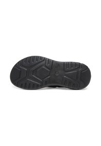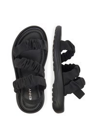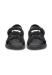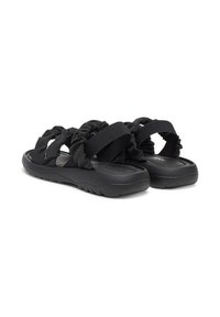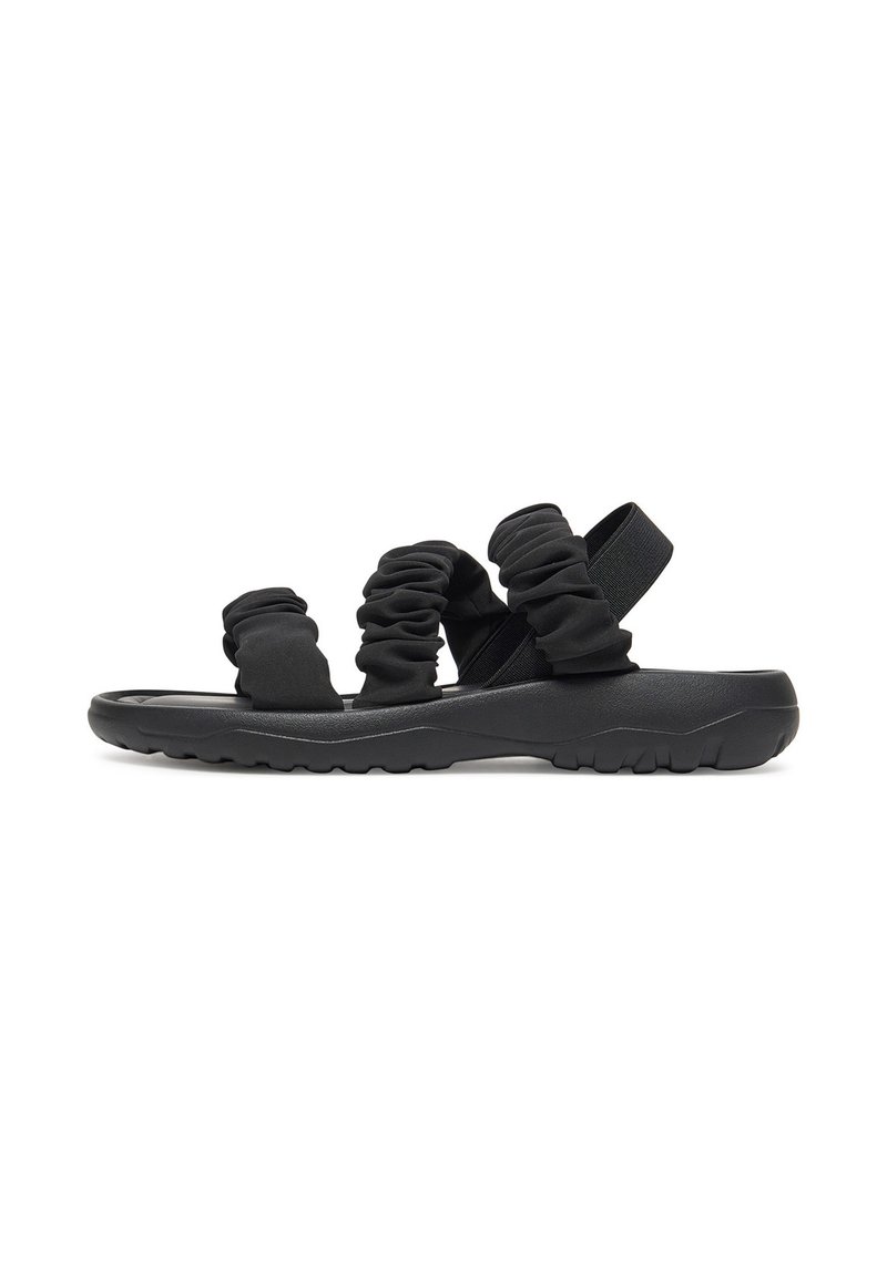 Czarne sandały z gumową podeszwą, wyściełanymi paskami z tkaniny o marszczonym wzorze oraz regulowanym paskiem z tyłu dla komfortu.