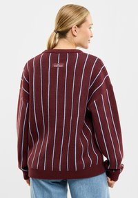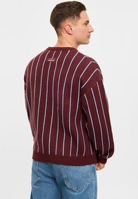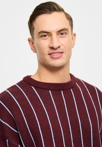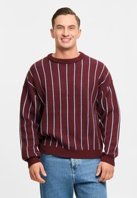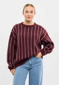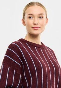 Bordowy sweter robiony na drutach w niebieskie paski, z okrągłym dekoltem i ściągaczami. Połączony z jasnoniebieskimi dżinsami.