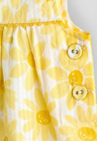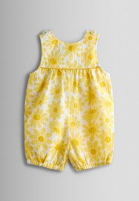 Żółty i biały bezrękawnik niemowlęcy z nadrukiem słonecznika i zapięciami na guziki na ramionach i bokach.