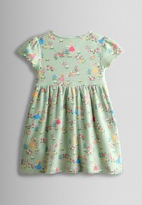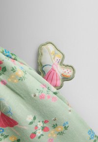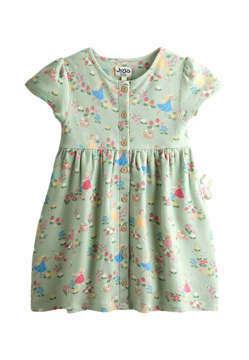 Zielona sukienka dla malucha z krótkimi rękawkami, drewnianymi guzikami z przodu oraz wzorem wróżek i kwiatów w kolorach różowym, niebieskim, żółtym i białym.