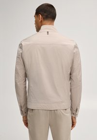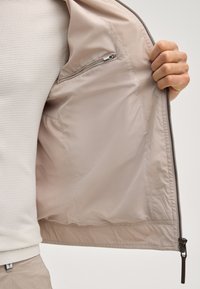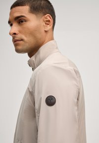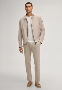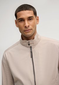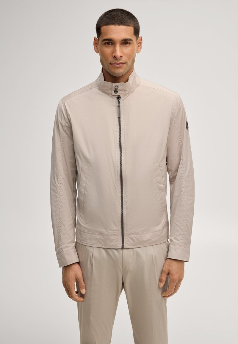 Mężczyzna w jasnobeżowej kurtce na zamek z kołnierzem typu stójka i dopasowanych spodniach na jednolitym szarym tle.