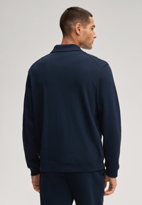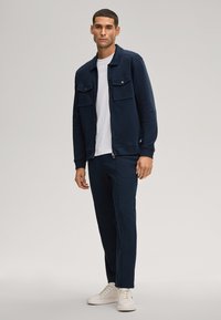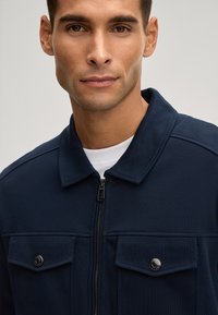 Granatowa kurtka zapinana na zamek, wykonana z miękkiego materiału, z kołnierzem, dwoma kieszeniami na piersi zapinanymi na napy oraz ściągaczami na rękawach. Prosty design, minimalistyczne detale.