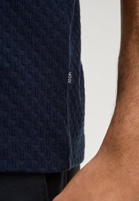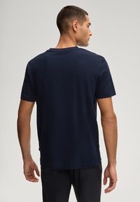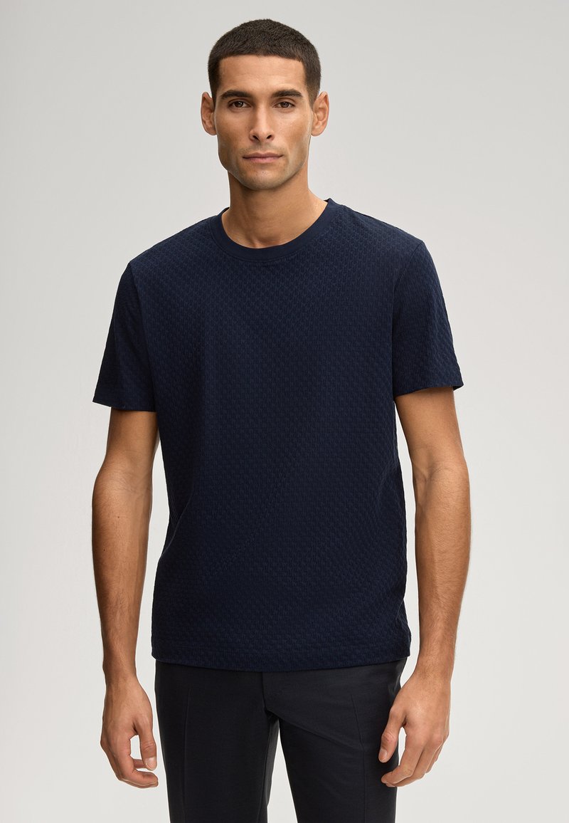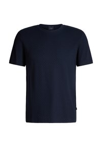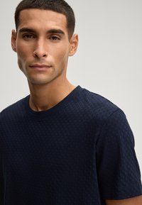 Granatowy T-shirt z krótkim rękawem o strukturze wzoru, okrągłym dekoltem i luźnym krojem, zestawiony z ciemnymi spodniami.