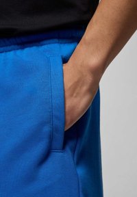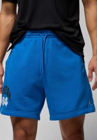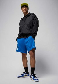 Mężczyzna noszący jasnoniebieskie spodenki Jordan z nadrukiem "84" na lewej nogawce, czarne skarpetki za kostkę oraz białe, niebieskie i czarne buty Nike.