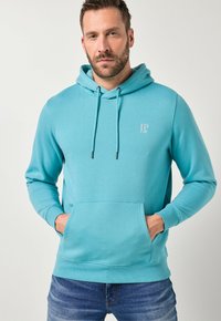 Mężczyzna w turkusowej bluzie z kapturem, z kieszenią z przodu i logo na piersi, ręce częściowo w kieszeniach, stojący na jednolitym tle.