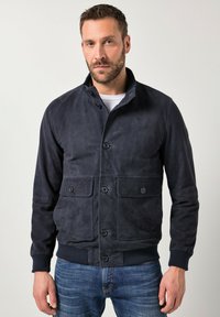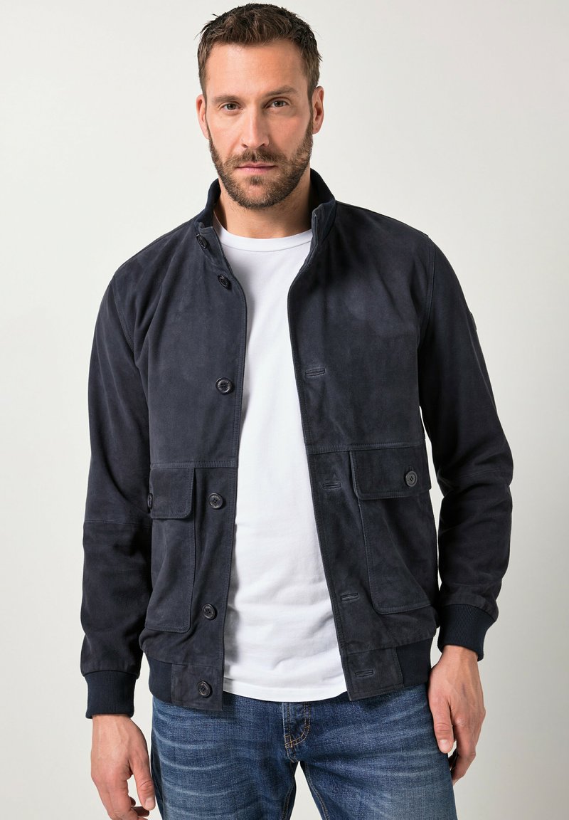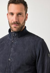Mężczyzna z krótkimi włosami i brodą, ubrany w granatową, zapinaną na guziki kurtkę na białej koszulce i niebieskie dżinsy, stojący na jednolitym tle.