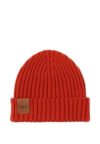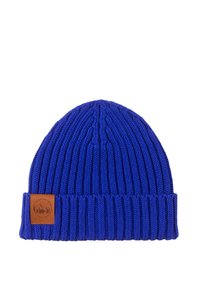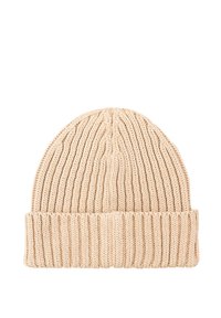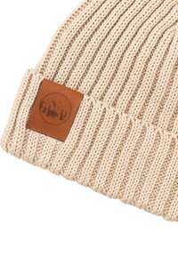 Beżowa dzianinowa czapka z prążkowaną fakturą i brązową skórzaną naszywką, zestawiona z jasno beżową bluzą z okrągłym dekoltem. Neutralna paleta kolorów.