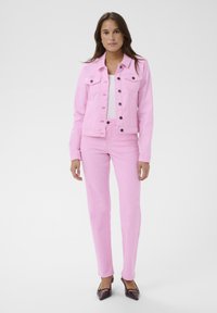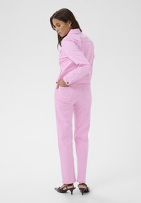 Młoda kobieta o długich brązowych włosach, ubrana w różową kurtkę jeansową zapinaną na guziki oraz pasujące różowe spodnie, stojąca na jednolitym tle.