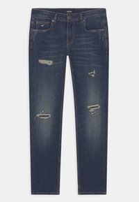 Ciemnoniebieskie jeansy z denimu z przetarciami. Posiadają pięć kieszeni, szlufki na pasek oraz proste nogawki. Klasyczne zapięcie na guzik i zamek błyskawiczny.