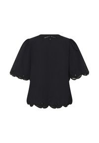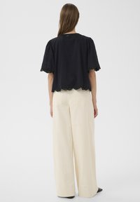 Młoda kobieta o jasnobrązowych włosach, ubrana w czarną, haftowaną bluzkę z krótkim rękawem i kremowe spodnie, z założonymi rękami, na neutralnym tle.