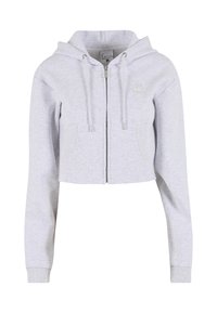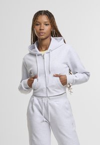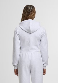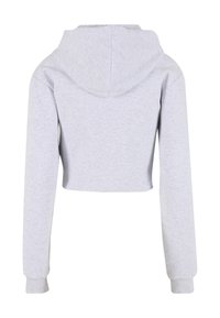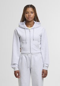 Szara krótka bluza z kapturem z przednim zamkiem, troczkami i kieszenią kangurka; miękki materiał i ściągacze przy mankietach. W komplecie z dopasowanymi spodniami.
