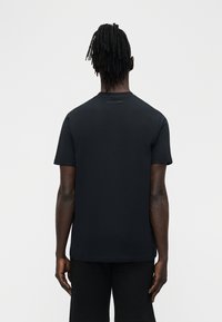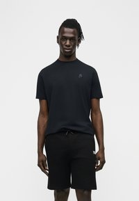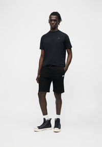 Mężczyzna w czarnej koszulce z krótkim rękawem z małym logo na piersi oraz czarnych szortach ze ściągaczem, stojący na tle jednolitego jasnego tła.