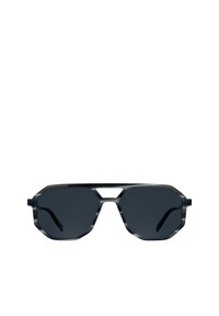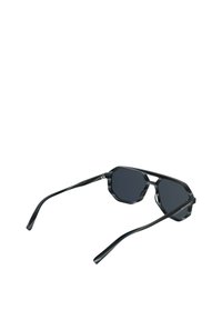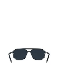 Czarne ośmiokątne okulary przeciwsłoneczne z ciemnymi soczewkami, przezroczystą, wzorzystą oprawką i smukłymi metalowymi zausznikami. Logo marki widoczne z boku.