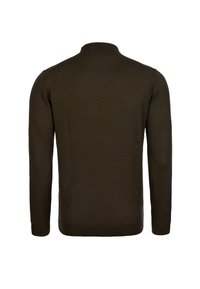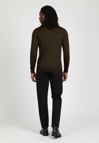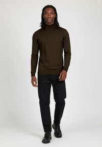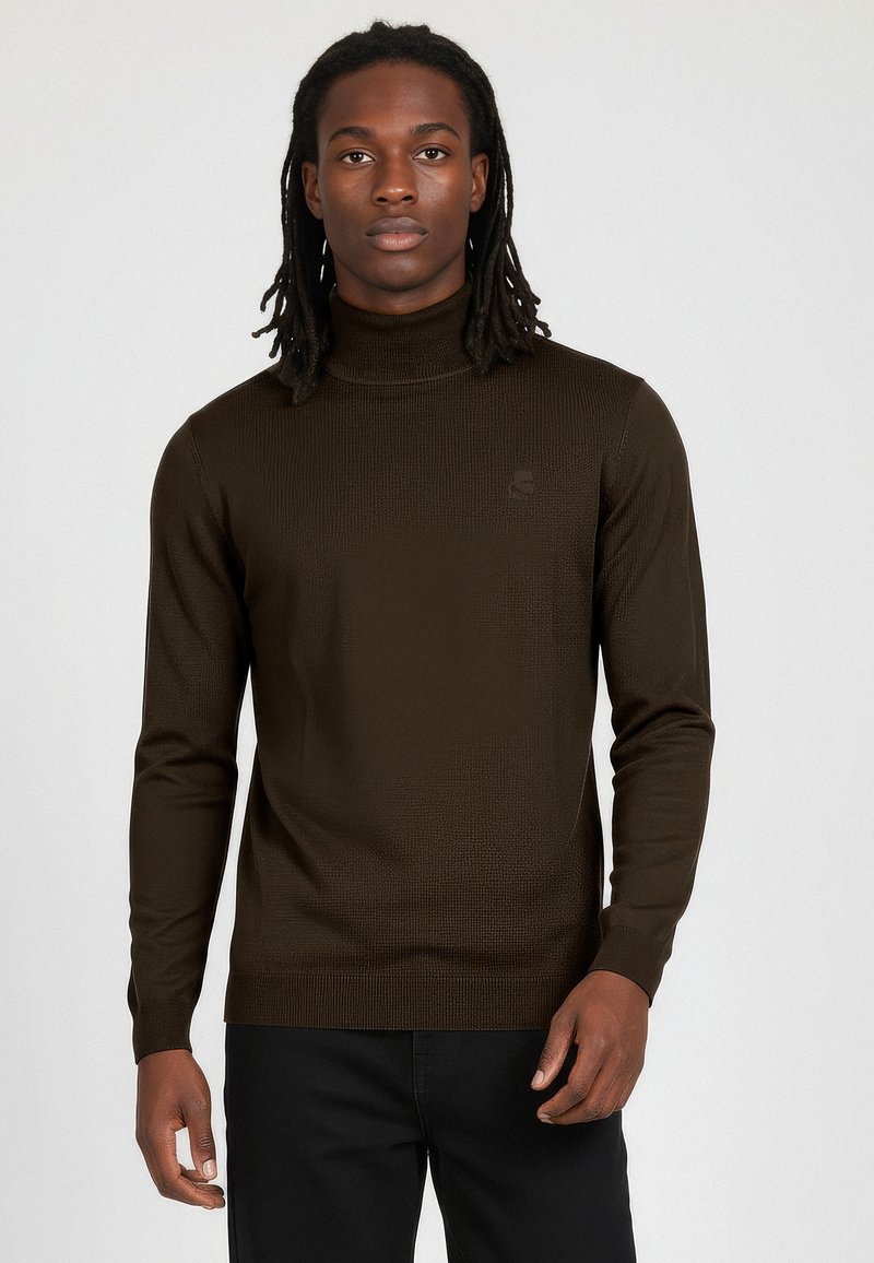 Młody mężczyzna z dredami, ubrany w ciemnobrązowy sweter z golfem i czarne spodnie na jednolitym jasnym tle.