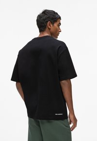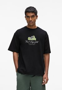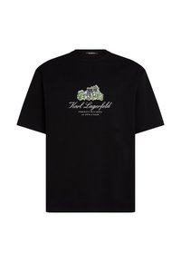 Czarny t-shirt z krótkim rękawem, z kolorowym nadrukiem przedstawiającym budynki oraz napisem "Karl Lagerfeld French Riviera" w białym kolorze.