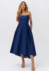 Kobieta o długich falowanych włosach, ubrana w granatową sukienkę midi bez ramiączek i beżowe sandały na kostkę, stojąca na jednolitym tle.