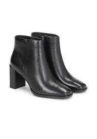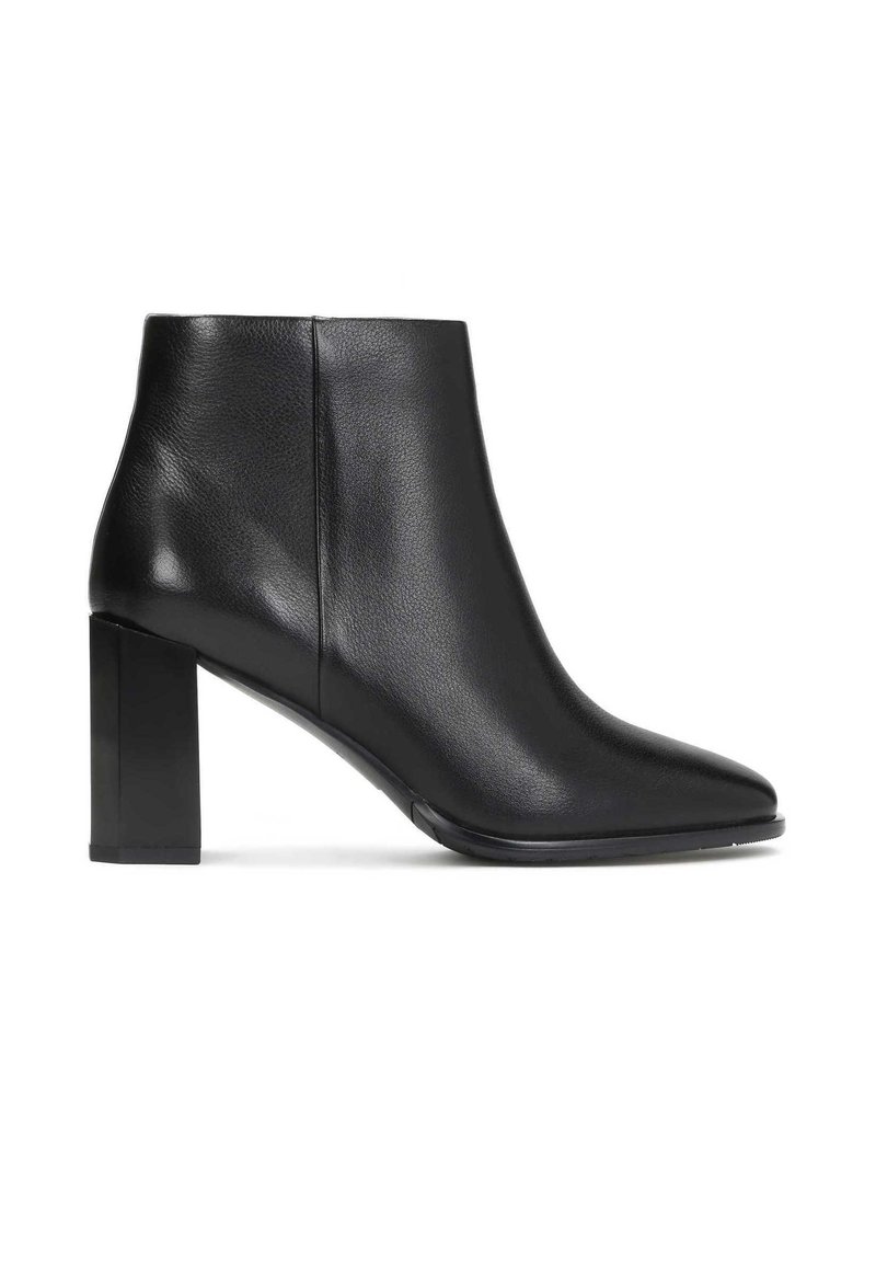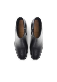 Czarny skórzany botek za kostkę z ostrym noskiem i masywnym słupkowym obcasem, widok z boku na białym tle.