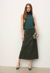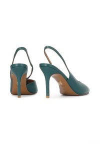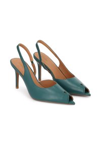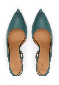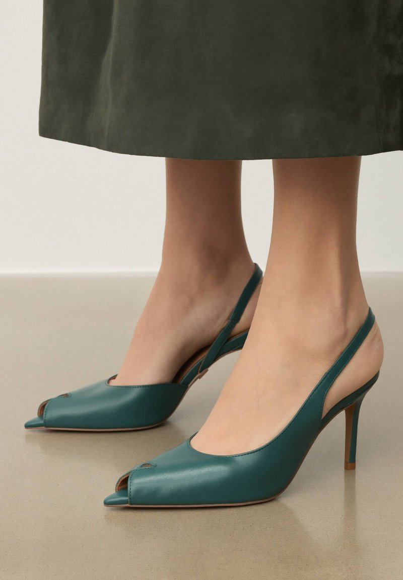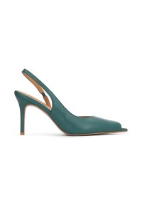 Buty na obcasie typu slingback w kolorze zielonkawym z cielęcej skóry, z wąskim, spiczastym noskiem i otwartą konstrukcją. Błyszcząca faktura, cienki obcas typu szpilka oraz wycięcia po bokach.