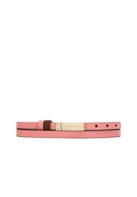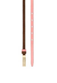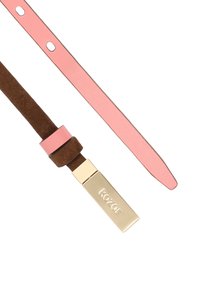 Dwustronny pasek to opcja dla kobiet, które lubią modową elastyczność. Wykonany ze skóry naturalnej, łączy dwie kontrastowe strony: różową stronę w gładkim wykończeniu oraz matowy brązowy zamsz po drugiej stronie. Złota, obrotowa klamra z logo KAZAR pozwala na natychmiastową zmianę stylu – od romantycznego po klasyczny. Smukła forma i wyrafinowane detale nadają mu charakter biżuteryjnego akcentu, który podkreśli talię zarówno w eleganckiej sukience, jak i w casualowym zestawie z dżinsami.