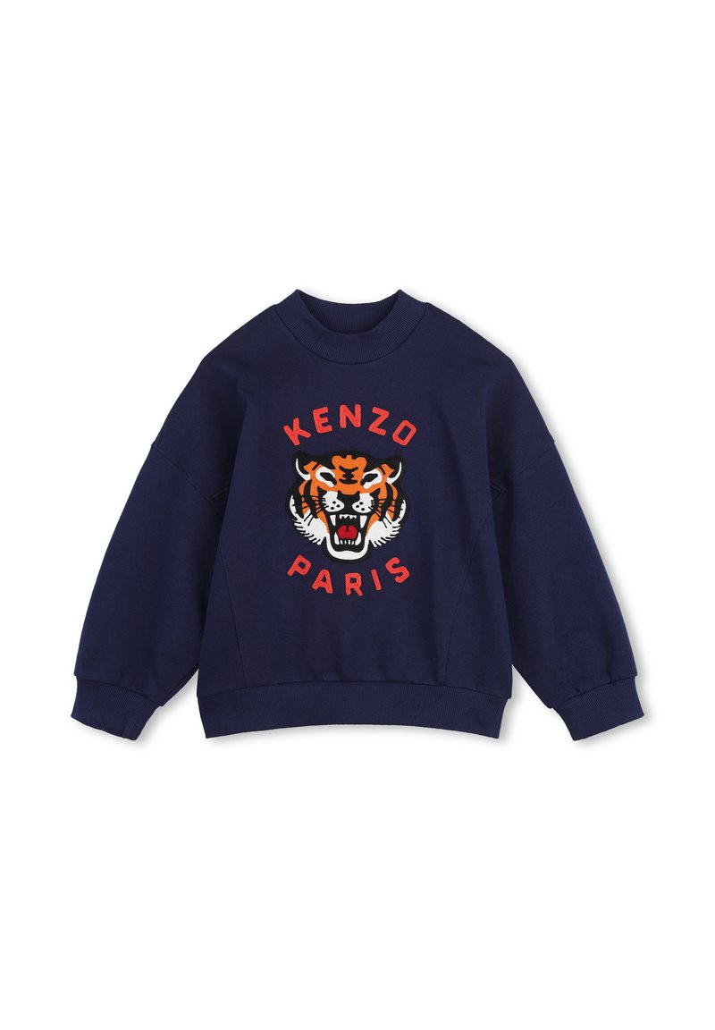Granatowa bluza z prążkowanym dekoltem, z wyrazistym pomarańczowym nadrukiem tygrysa i czerwonym napisem "KENZO".