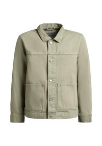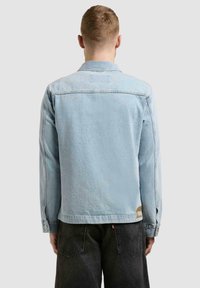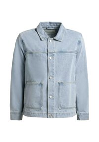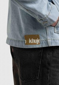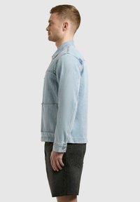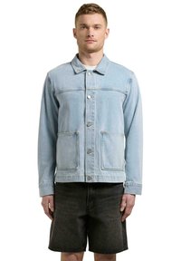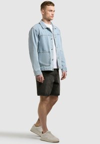 Mężczyzna w jasnoniebieskiej kurtce dżinsowej, białej koszulce, czarnych szortach dżinsowych i kremowych trampkach stojący na jednolitym tle.