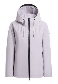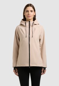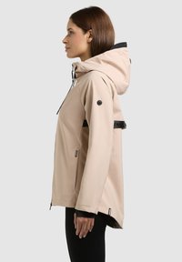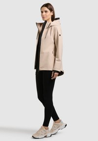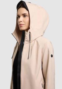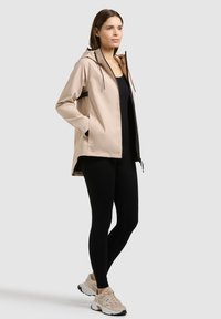 Kobieta w beżowej kurtce z kapturem i czarnym zamkiem błyskawicznym, stojąca na tle jednolitego, jasnoszarego tła, zwrócona przodem z neutralnym wyrazem twarzy.