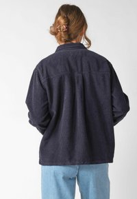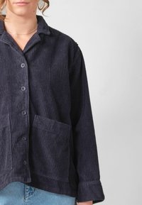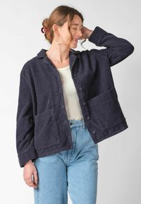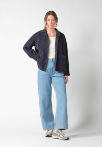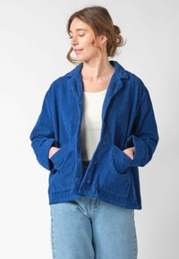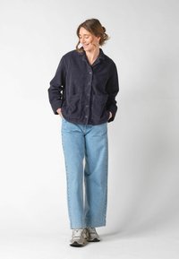 Kobieta w ciemnoniebieskiej sztruksowej kurtce zapinanej na guziki, z kieszeniami, oraz jasnoniebieskich dżinsach, stojąca na tle jednolitego jasnego tła.