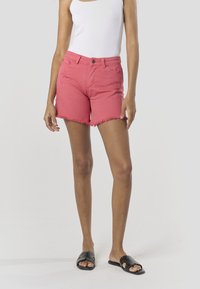 Różowe szorty z denimu z postrzępionym dołem, ozdobione przetarciami, zestawione z czarnymi sandałami typu slide. Modelka ma na sobie biały top na ramiączkach.