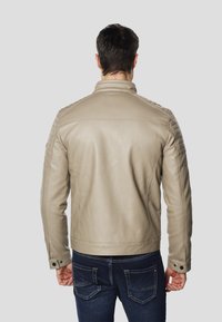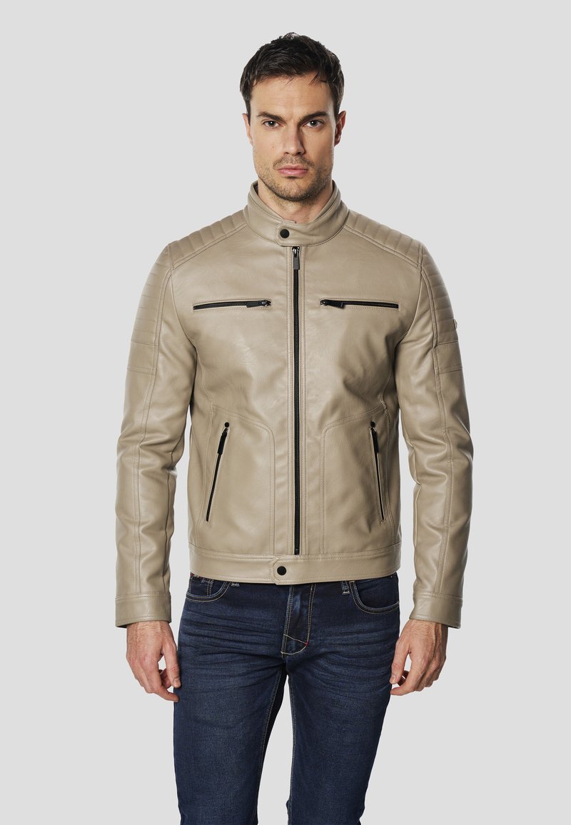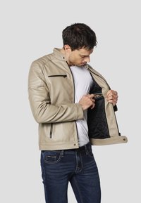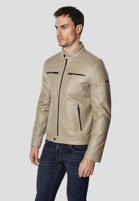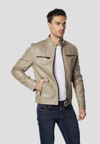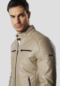 Beżowa skórzana kurtka motocyklowa z wysokim kołnierzem, dwoma zasuwanymi kieszeniami na piersiach oraz teksturowanymi akcentami na ramionach. Noszona z ciemnymi dżinsami.