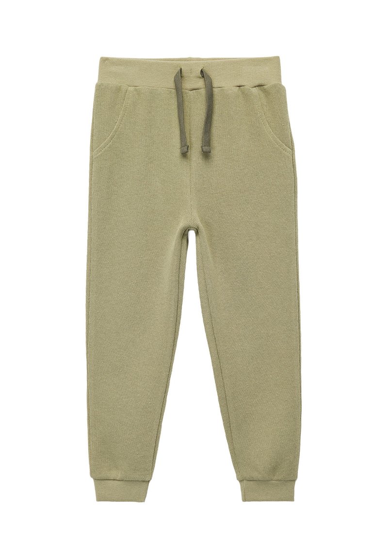 Jasnozielone dzianinowe spodnie dresowe z elastycznym pasem i sznurkiem do regulacji, z dwoma bocznymi kieszeniami i prążkowanymi mankietami na kostkach.