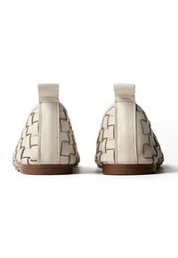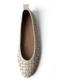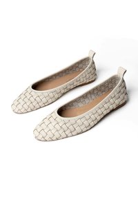 Beżowy płaski but z plecionej skóry z szpiczastym noskiem, niskim obcasem i tylną pętelką, przedstawiony z boku na białym tle.